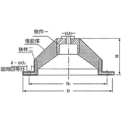 JGD型橡膠剪切隔振器是由內(nèi)、外鋼套和中間的合成橡膠組成,經(jīng)硫化呈中空?qǐng)A錐體,橡膠部份受剪切力,具有較大的變形范圍和較低的固有頻率。工作溫度范圍在-15℃-+80℃。溫度變化時(shí),剛度也有所變化:阻尼比C/C�!�0.07。對(duì)于水泵、壓縮機(jī)、通風(fēng)機(jī)、發(fā)電機(jī)組、冷凍機(jī)等機(jī)械設(shè)備的積極隔振和儀器儀表的消極隔振都有良好的隔振效果。